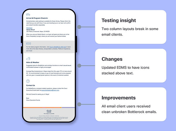 After the event was completed and the surveys filled out, this Cisco event was deemed a success because 85% of the invited tech leaders registered and attended. One key lesson learned through this project was the importance of testing early, so alternative designs or fixes can be implemented before launch. We were able to redesign and update emails, but this happened after the initial launch.