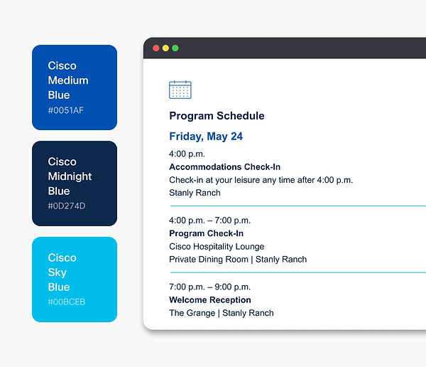 The challenge was how to entice the invitees to attend the event, collect the needed information for registration, and provide all the information both important and fun to make sure they have a good time and learn how incredible Cisco’s technology solutions are. In addition, the designs needed approval by both Cisco and Live Nation.